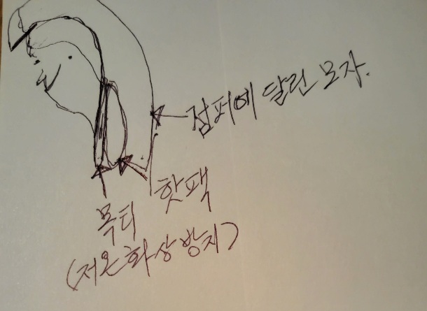 Àú¿ÂÈ»ó ÀÔÁö ¾Êµµ·Ï ¸ñƼ·Î ¸ñÀ» °¨½Î°í, ¸ñƼ µÚ¿¡ ÇÖÆÑ Çϳª¸¦ ³Ö°í, ÈĵåÁ¡ÆÛ¿¡ ´Þ·ÁÀÖ´Â ¸ðÀÚ¸¦ µ¤¾î½è´õ´Ï, ¸öÀ¸·Î ±× ¿ÀÌ ÆÛÁ®³ª°¡¸é¼ ¿ì¼±¿¡ ¸Ó¸®¿Í ¸ñÀÌ µû¶æÇØÁö°í ÀÌ¾î¼ ¿Â ¸öÀÌ µû¶æÇØÁ³½À´Ï´Ù.